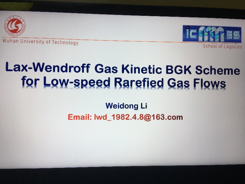 会议交流过程中,李维东副教授在大会上进行了英文的口头报告,报告题目为“Lax-Wendroff Gas Kinetic BGK Scheme for Low-speed Rarefied Gas Flows”。在报告中,对李老师课题组近期在介观数值方法方面的研究成果进行了介绍,并和与会代表在线上进行一些学术讨论和交流。
