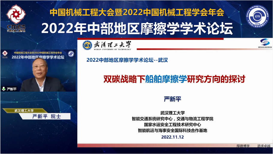 中国工程院院士、电竞博彩公司排名 严新平教授作了题为“双碳战略下船舶摩擦学研究方向的探讨”的大会特邀报告。