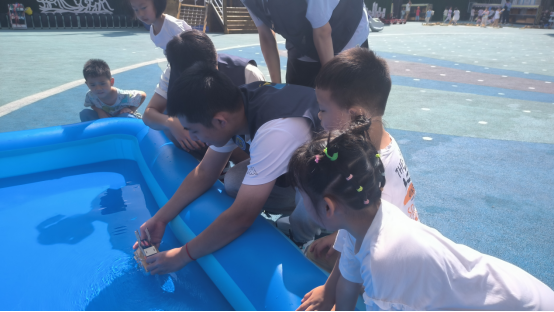 “有哪位小朋友知道钢铁做成的船为什么漂在水面上?”科创团队用贴近孩子们的语言风格,将船的分类与功能、船舶航行原理以及所内含的科学知识生动讲述,激发了孩子们对水路交通的兴趣。团队队员带着孩子们来到室外,安装简易的小船模型,并放在水池中体验船模的漂浮与游动,让孩子们在玩乐中学习了知识,更让他们体验到了实践的乐趣和成功的喜悦。