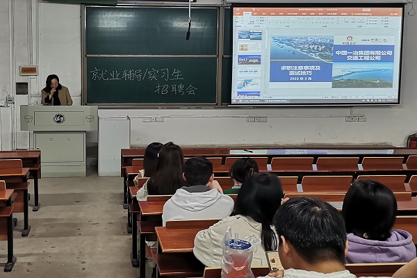 大三学年逐渐接近尾声,为了让同学们了解到真实的职场,明确自己的职业方向和职业目标,提高同学们的综合职业素养,提升同学们的市场竞争力,2020级交通、油气类于4月9日于东配楼101教室开展就业辅导和实习生招聘会。会议由辅导员洪琳老师主持,中国一冶交通集团人才招聘相关负责人熊璐进行宣讲,2020级交通、油气类全体同学参与。