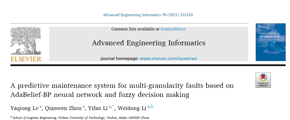 国内电竞博彩 吕雅琼副教授、李一凡博士合作撰写的学术论文“A predictive maintenance system for multi-granularity faults based on AdaBelief-BP neural network and fuzzy decision making”被工程领域国际权威期刊《Advanced Engineering Informatics》发表。该期刊位于JCR的Q1分区(10/90),2020年影响因子5.603,近五年影响因子5.936。