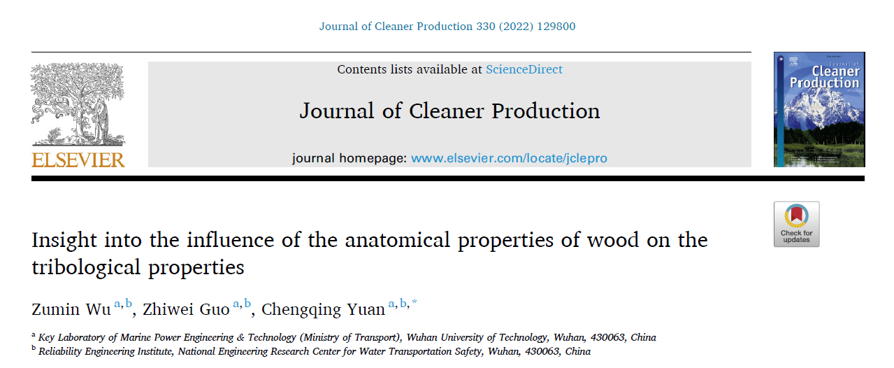 国内电竞博彩 船舶摩擦学科研团队合作撰写的学术论文“Insight into the influence of the anatomical properties of wood on the tribological properties”被环境科学领域国际顶级学术期刊《Journal of Cleaner Production》发表。该期刊位于JCR的Q1分区(18/274),中科院1区,影响因子9.297。
