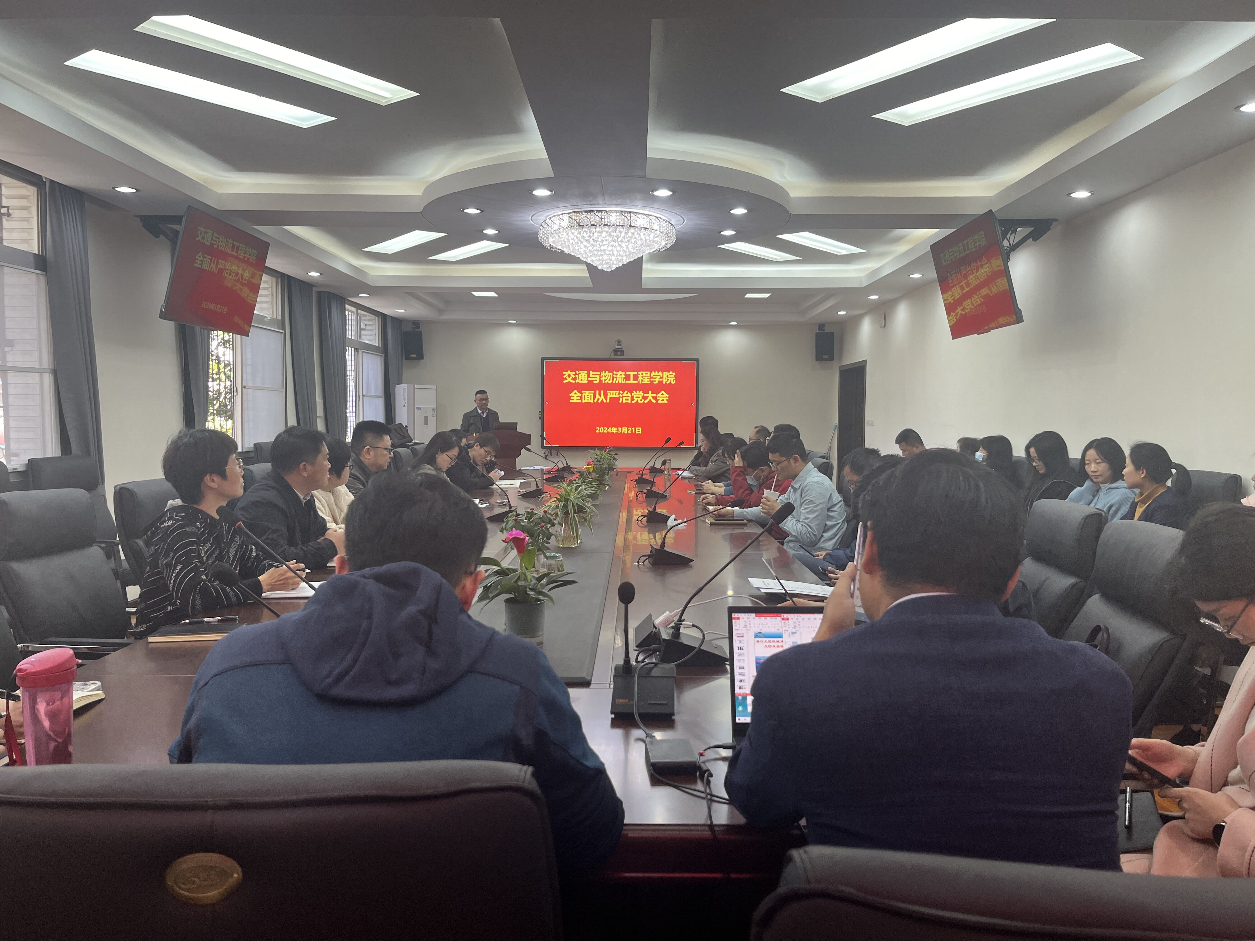 3月21日下午,国内电竞博彩 在218会议室召开全面从严治党大会,会议采取线上线下形式召开,院领导班子成员、系所中心主任、教工党支部书记、机关全体人员线下参会,其余教工在各系所中心集中线上参会。会议由院党委书记肖耀根主持。