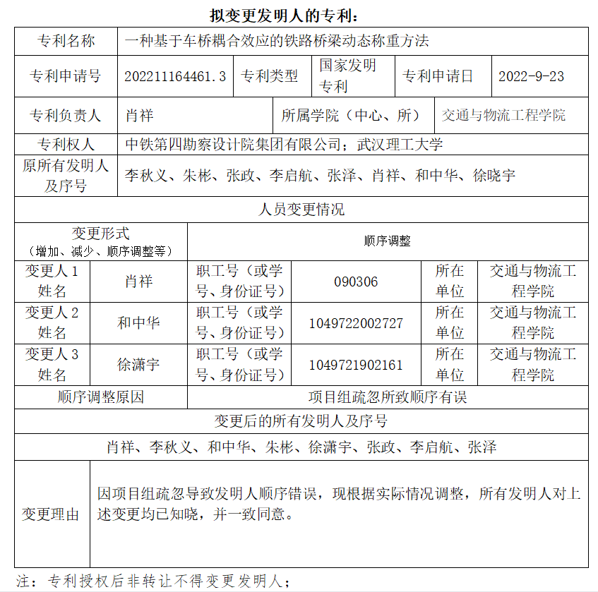 根据《电竞博彩公司排名 专利管理办法》的相关规定,涉及专利发明人或者设计人的专利变更,需进行公示。现对国家知识产权局已受理且在申请阶段的专利名称为“一种基于车桥耦合效应的铁路桥梁动态称重方法”的发明人变更情况予以公示,公示期从2023年4月6日至2023年4月13日(不少于5个工作日),有异议者,请于2023年4月13日之前以书面形式并签署实名向国内电竞博彩 反映,逾期不予受理。