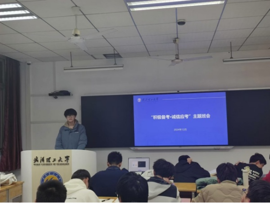 为进一步推动学校考风考纪建设,加强学生诚信考试意识,营造良好的学习和考试氛围,12月11日,机设2402班于航海楼508教室顺利召开“积极备考·诚信应考”主题班会。会议由班长黄文坚主持,机设2402班全体同学参与。