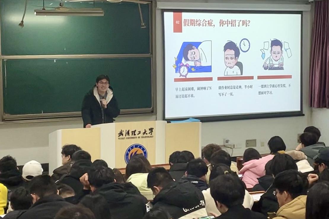 接着,孙老师强调同学们返校后应尽快调整个人状态,从作息、饮食、思维与情绪入手,摆脱“假期综合症”。孙老师针对同学的假期综合症进行了详细分析并提供了解决方案,他指出,引起假期综合症的原因可能在于作息不规律、假期过度放松以及学习动力匮乏。孙老师建议同学们从今晚开始调整作息,从早睡早起、制定学期计划与每日具体任务、设置适当的任务完成奖励机制、坚持运动锻炼强身健体等几个方面做起。